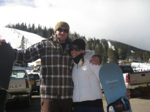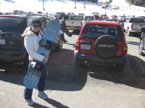 We were excited to find someone to take a picture of both of us in the parking lot with our snowboards. 🙂