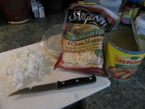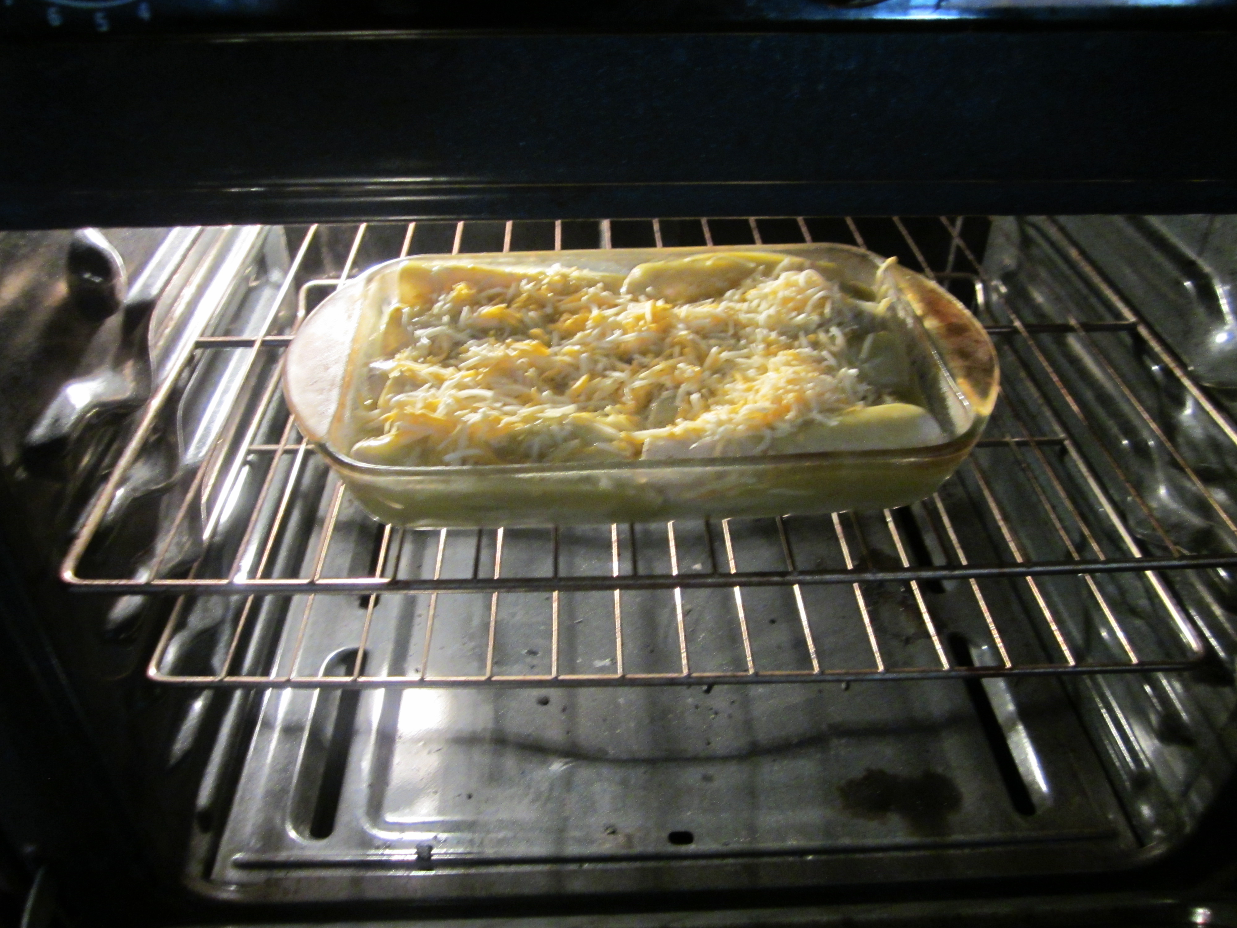 I bought the taco size corn tortillas from a local market and cut up onions, boiled shredded chicken, and poured some green sauce inside each tortilla. I rolled them up and placed them along my pan (I ended up with ten rolled up tortillas), and then poured the remaining sauce over it.