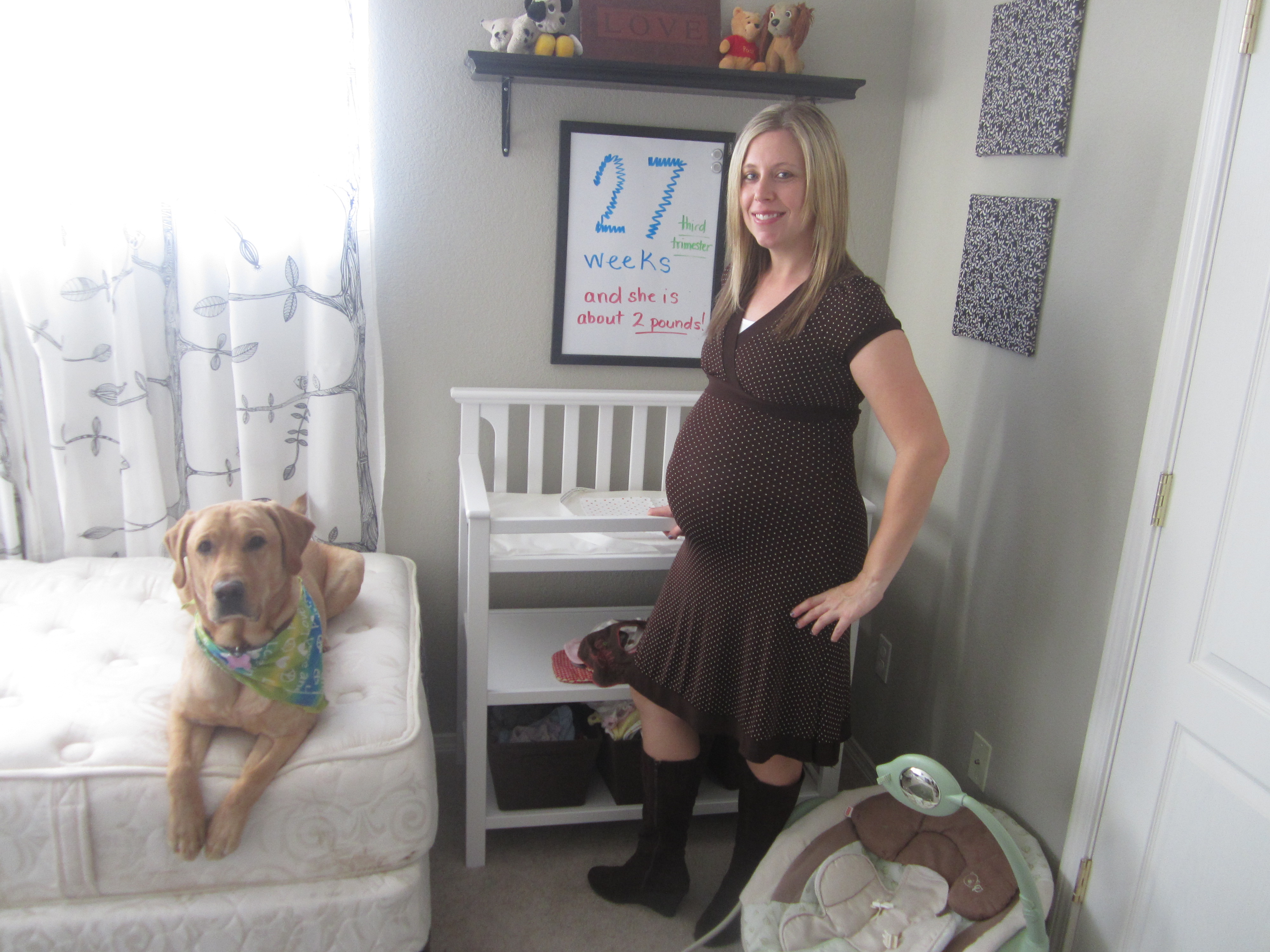 Best moment this week: I am not going to lie, there was really nothing too exciting about this week, and if it was, it wasn’t the “best”. My mom sent us a rug and bumper with cute little bugs on it that I put up in the nursery. Way cute. Also, I am loving how excited Mike is getting about things. He keeps going into the nursery and sitting and looking at everything.