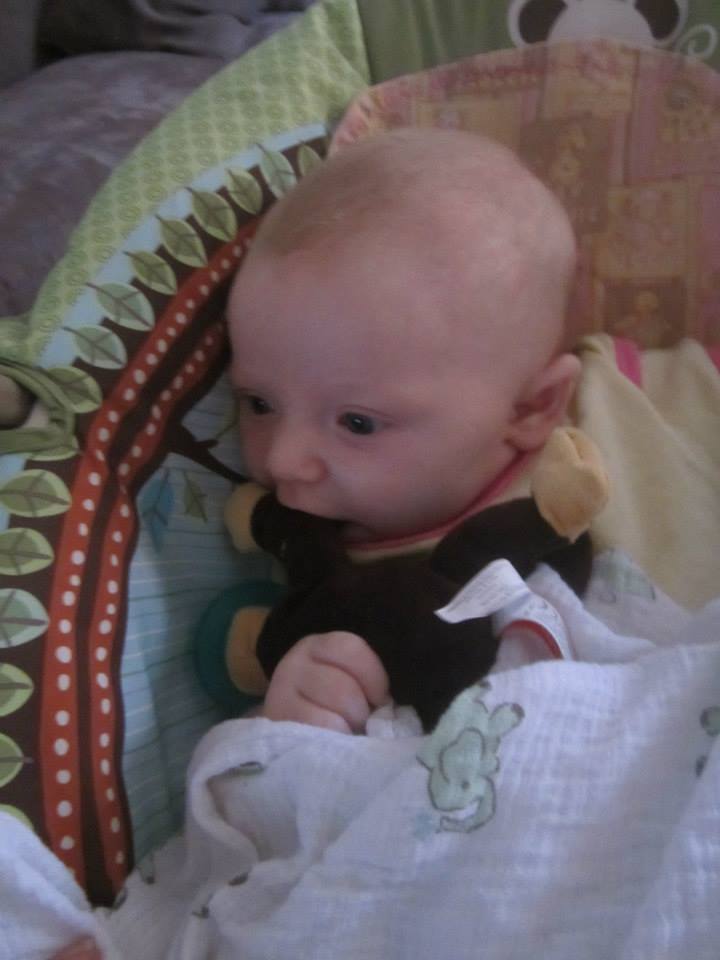 Milestones: She reached out and grabbed a toy that makes noise this morning. Lots of smiling and cooing. Sitting up all by herself with the aid of a couch or Bumbo. She is starting to get different cries for different things.