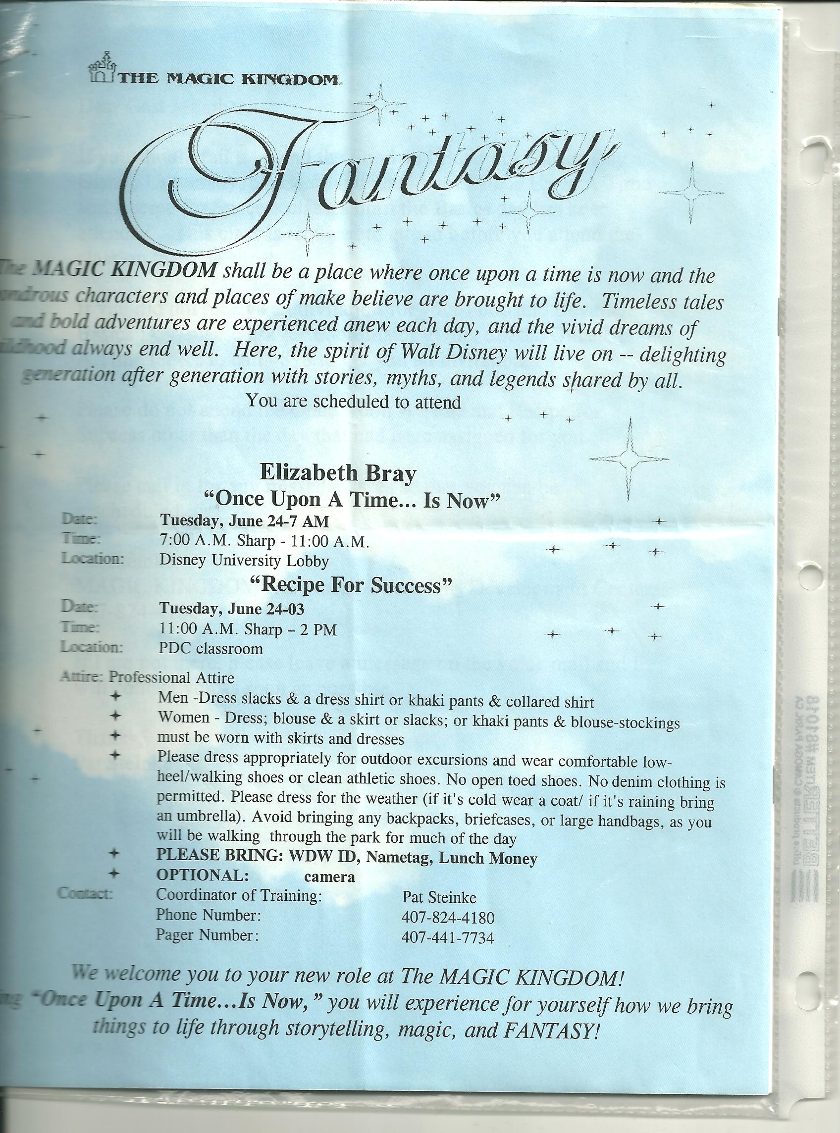 I’ve been de-cluttering my upstairs this past week and I came across my scrapbooks from 2000 on. I found this whole scrapbook on when I went down to Orlando, Florida in June of 2003. It was seriously one of the best summers I had. I always had dreamed of working at Walt Disney World and was able to check it off on my bucket list. I’ll show you some of the “behind the scenes” things I kept. (I am soooo sad that I lost my name tag with my name and where I was from! That was the best souvenir!)