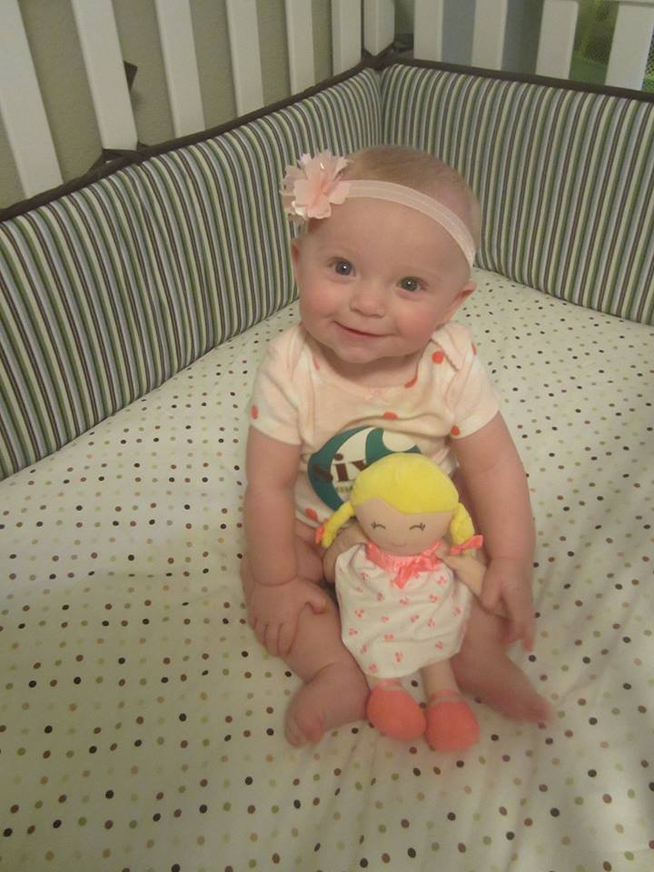 Facts: Rolling, sitting up unassisted, eating more baby food, upped her formula intake, loves to sing and coo, sees mom and dad across a crowded room VERY well, grabs things like a champ!